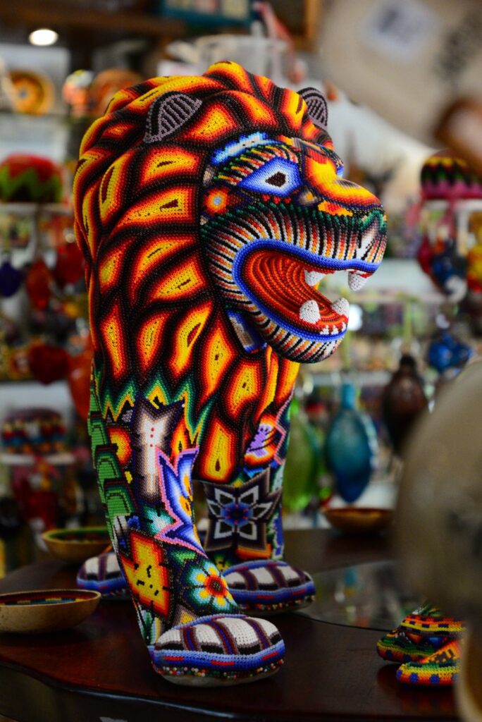 Shops like Mexicarte collaborate directly with Indigenous communities that continue to use traditional materials, ancestral tools, and labor-intensive techniques. A single embroidered blouse may take weeks. A beaded jaguar can require tens of thousands of individually placed beads. Ceramics are fired, painted, and finished by hand—no shortcuts.